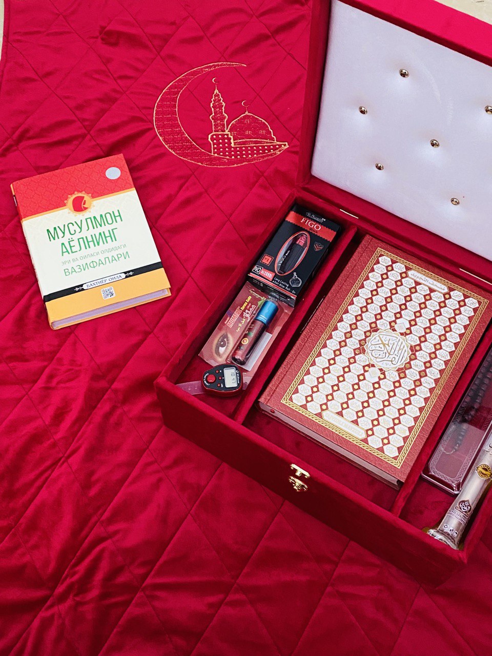 Мусулмон аёлнинг китоби Қуръони карим Мисвоқ Тасбеҳ кука Электрон тасбеҳ Мумтоз сурма Фиго атир Тасбеҳ қути Икки қаватли қути ..